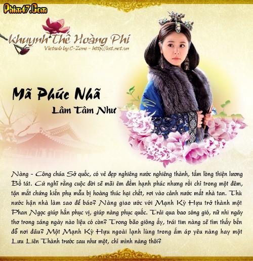 Nội dung phim: Đây là bộ phim đầu tiên do hãng phim của Lâm Tâm Như (Ruby Lin) sản xuất. Nữ diễn viên vào vai công chúa mất nước Mã Phức Nhã, người lần lượt kết hôn với ba vị hoàng đế nhưng chưa từng làm hoàng hậu mà cả đời chỉ làm hoàng phi. Đây cũng là một nhân vật có số phận thăng trầm không kém vai diễn Đậu Y Phòng của cô trong phim truyền hình đang rất ăn khách ở Trung Quốc Mỹ nhân tâm kế.